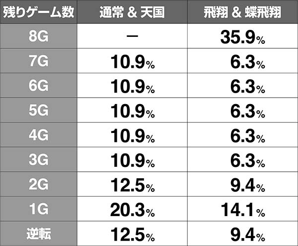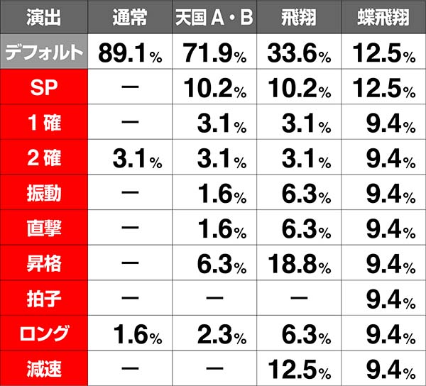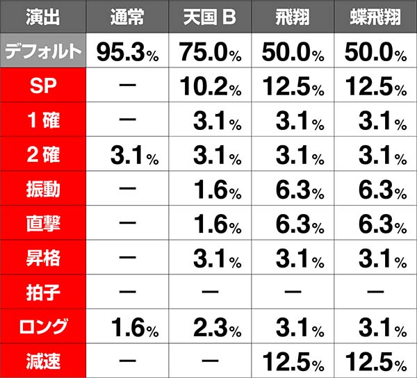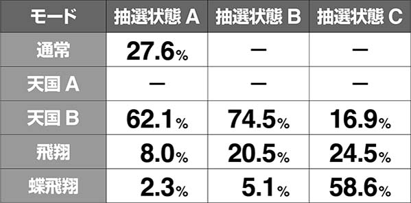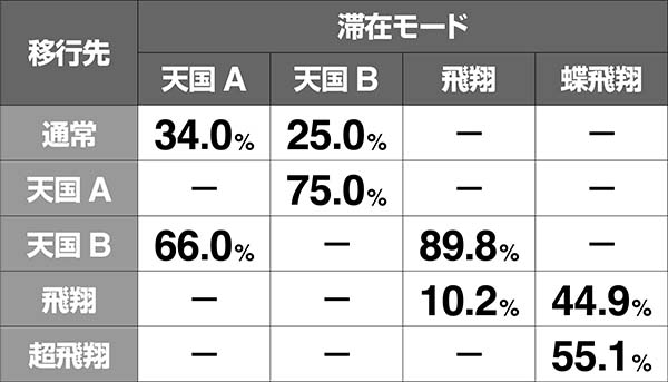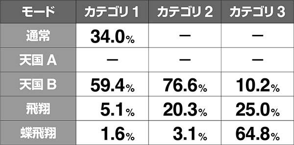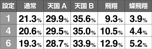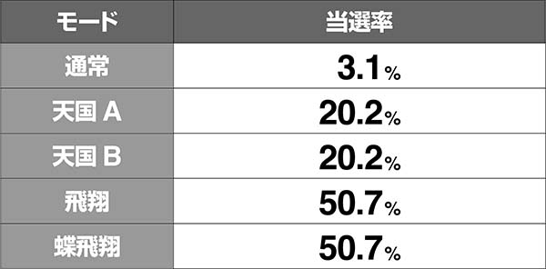 ボーナス中のモードは通常・天国A/B・飛翔・蝶飛翔の5種類。