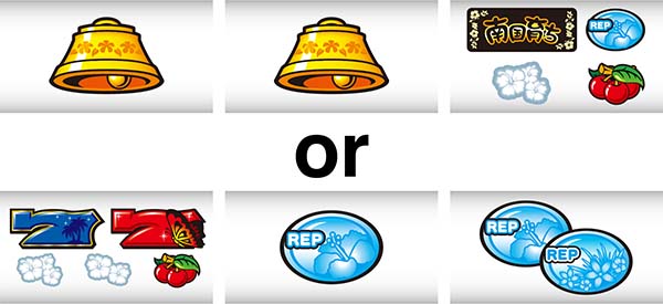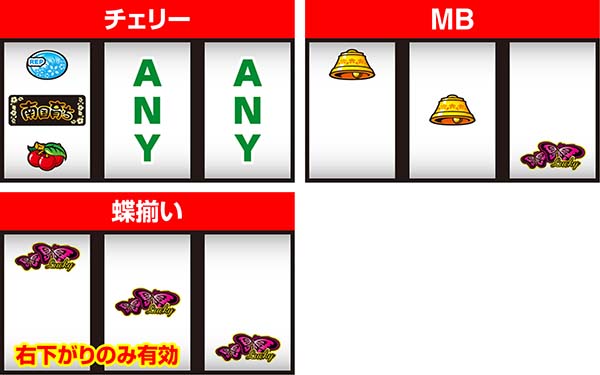 蝶チャンス役Aの場合、2/3の押し順と1/2の停止位置に正解することで、南国ボーナスに当選する。