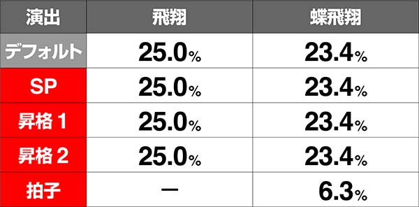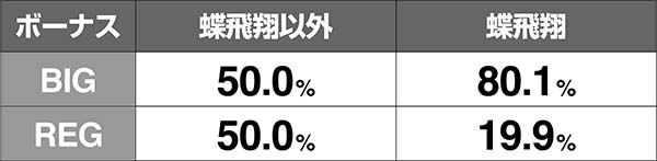 蝶揃いのチャンスとなる蝶チャンス役にはAとBの2種類があり、蝶チャンス役Bの方が蝶揃い期待度が高い。