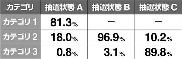 A〜Cのいずれかに振り分けられた後は、抽選状態ごとに1〜3のカテゴリを決定する。