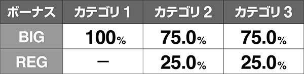 ボーナスが単発で終了する(通常モードが選択される)可能性があるカテゴリ1は、抽選状態Aでしか選択されない。