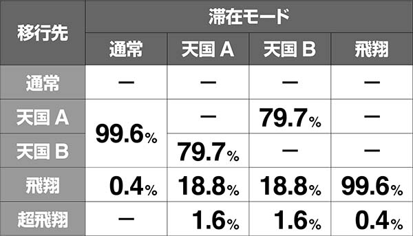 通常モード中にストックを獲得して天国に昇格した場合、通常Aからは天国B、通常Bからは天国Aへ昇格する(飛翔へ昇格する割合は共通)。