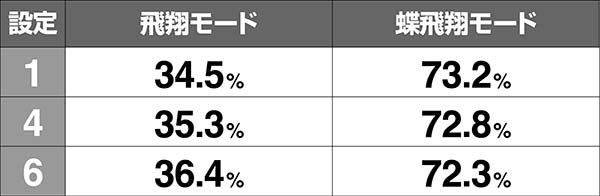 スペックは1セット30or80GのART機となっており、1Gあたりの純増は約1.8枚。 ART中は蝶が翔べば1G連という伝統の仕様で、ループ率は初回が約75%、2回目以降が82%以上とかなり強力な連チャン性能を秘めている。 蝶が虹色に光れば、ループ率は90%以上の最上位モードに突入するなど一撃性を秘めたトリガーも搭載。 まさに蝶が翔びまくる“シリーズ最高の翔びっぷり”を味わうことができるマシンだ。 |