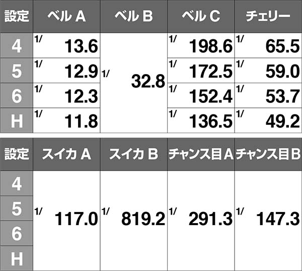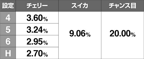 2連スイカを成功させた方が設定示唆をおこなう一枚絵が出現しやすくなり、銀枠と金枠は出現率が約2倍になる。