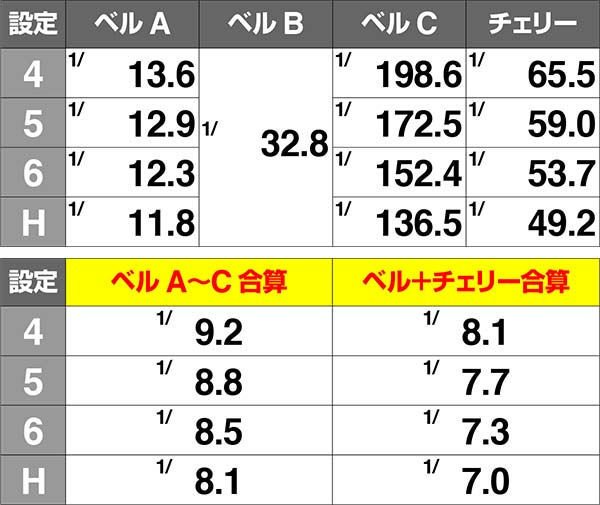 通常時のベルA・B、ボーナス成立後のベルB・Cと同じ停止形をとるため判別不可。