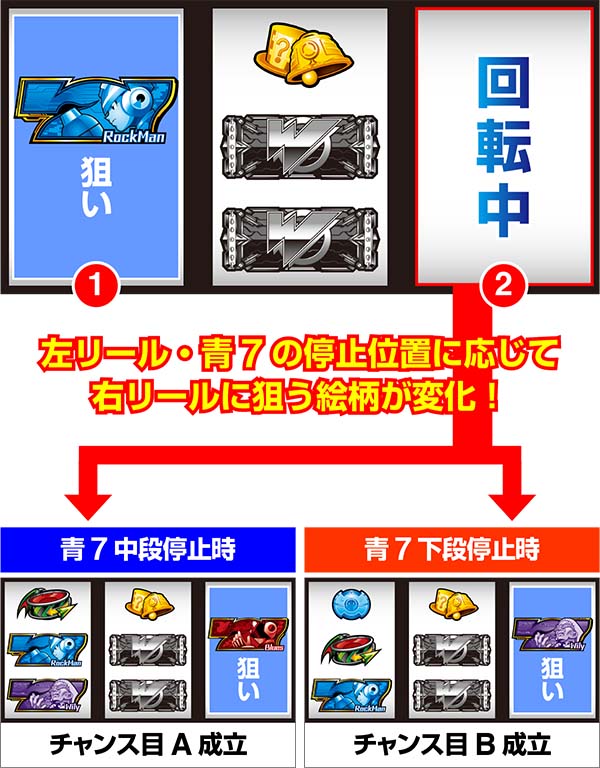 「ロックマン アビリティ 史上最大の試練」の仕様はボーナス+RTタイプ。 通常時はボーナスor規定ゲーム数消化で突入するアビリティフィールド(CZ)を経由してRT突入を目指す流れ。CZの成功期待度はゲーム数消化後なら50%、ボーナス後ならRT濃厚だ。 RTのゲーム数は4種類あり、開始時の目押しチャレンジで決定。最低でも30Gは獲得できるため、自身の技量に合わせて目押しに挑戦しよう。 |