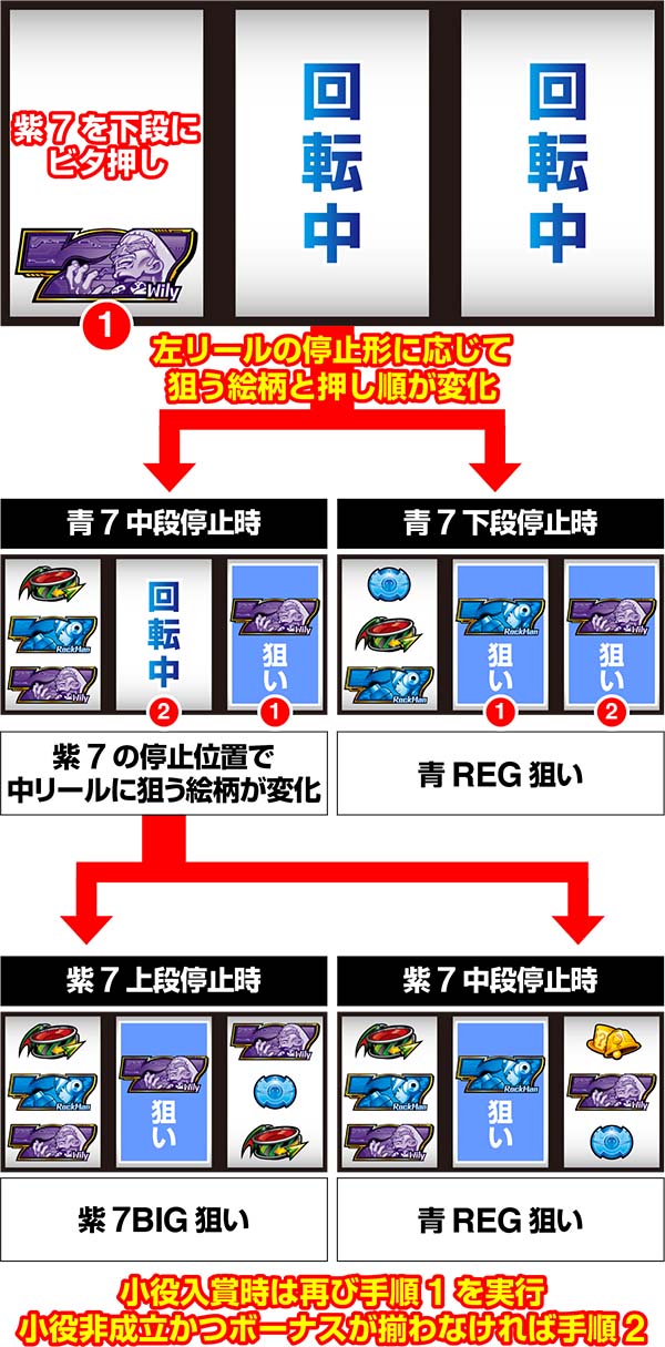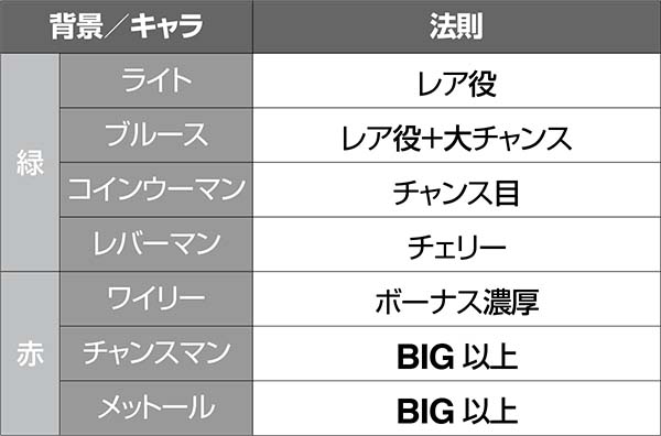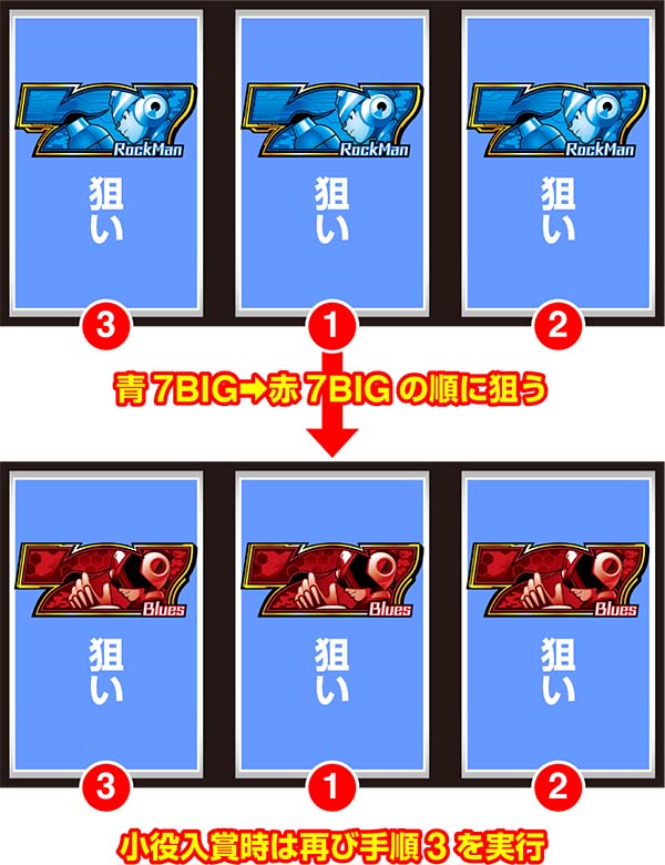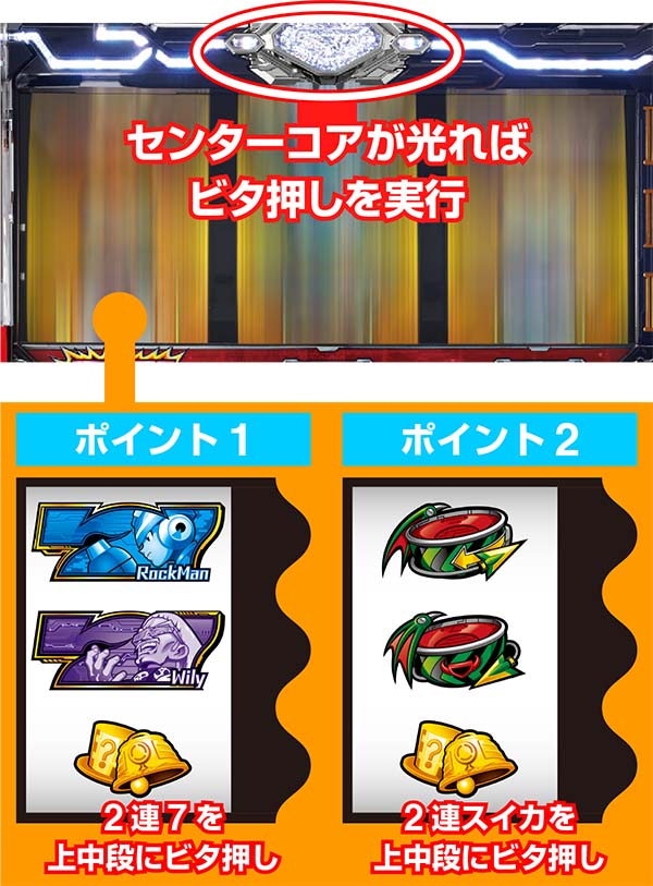 BIG・REGともにJACゲーム中以外は通常の小役狙いをおこない、JACゲーム中はセンターコアが発光した時のみビタ押しが必要となる。