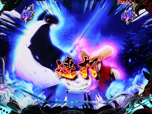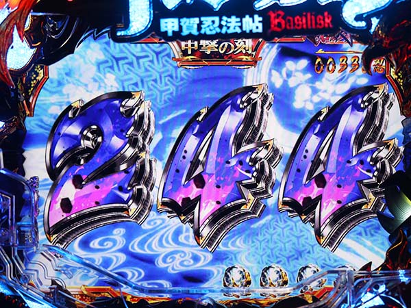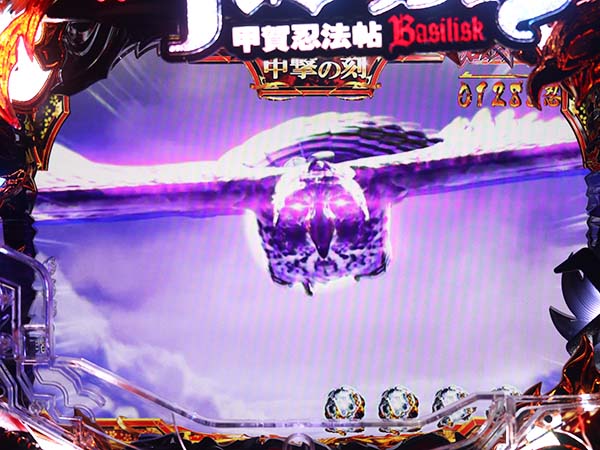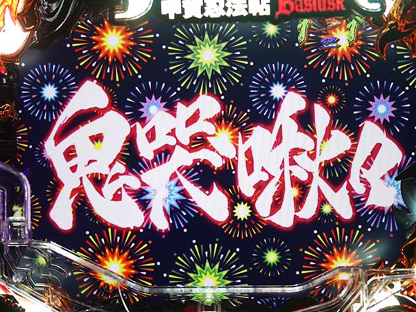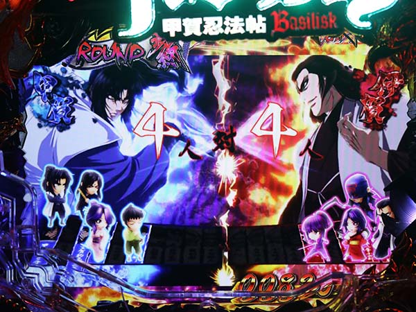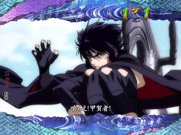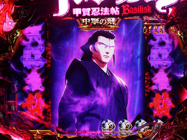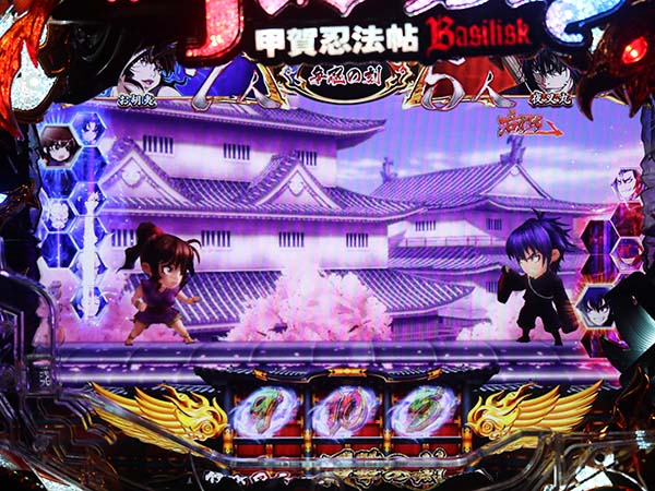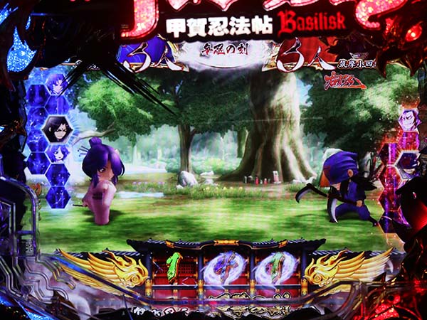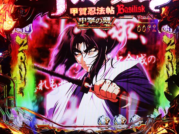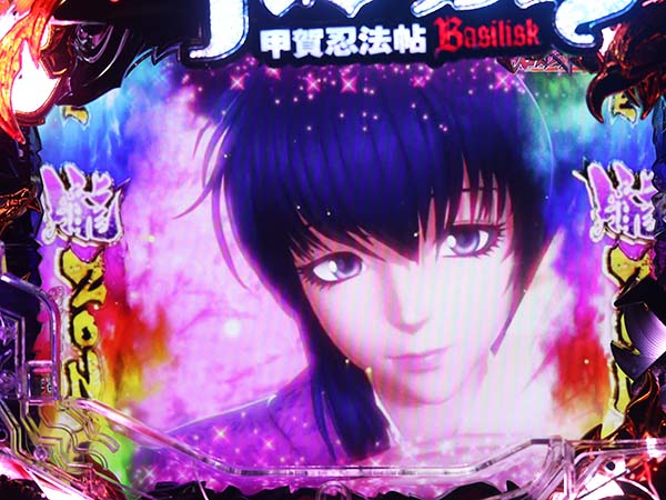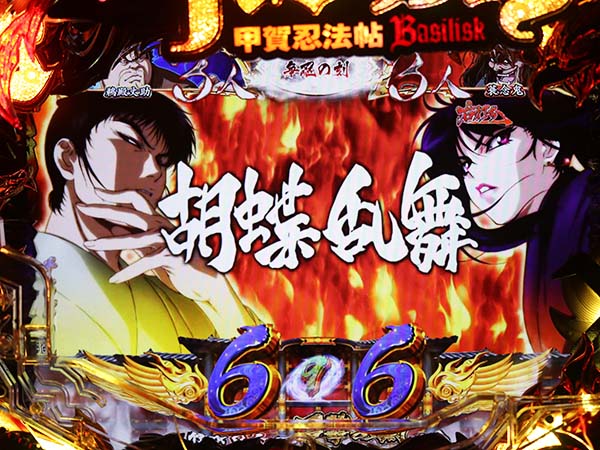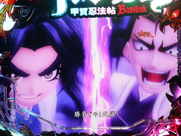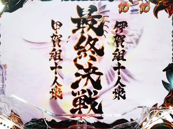 天膳の強襲により、再び不戦の約定が解かれる!! 今度の舞台は確変突入率65%の確変ループタイプ、電チュー経由の大当りは50%が16Rと安定感のあるスペック。 初当りは争忍ボーナスがメインで、大当り後に突入する「争忍の刻」が注目の新演出。争忍の刻中はお馴染みの3Dミニキャラたちによるバトルが展開され、甲賀が勝利すれば確変、負ければ時短終了とパチスロさながらの臨場感を楽しめる演出となった。 |