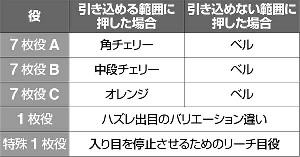 チェリーやオレンジを引き込めない位置で押しても代用でベルが揃うためオールフリー打ちでも問題ないのだが、各種フラグを判別するために、左リールチェリー狙いがオススメだ。