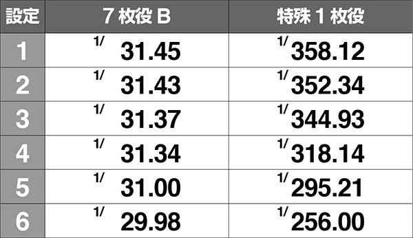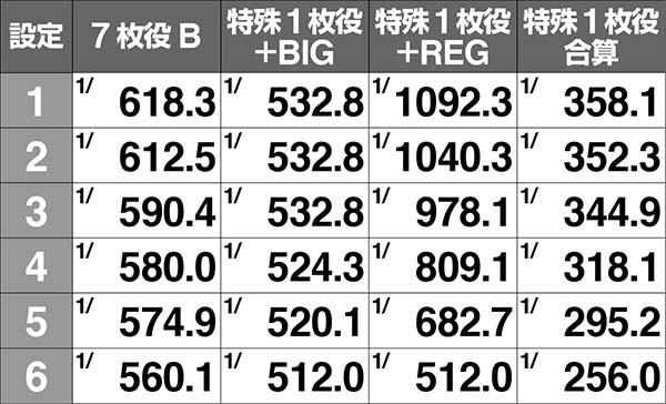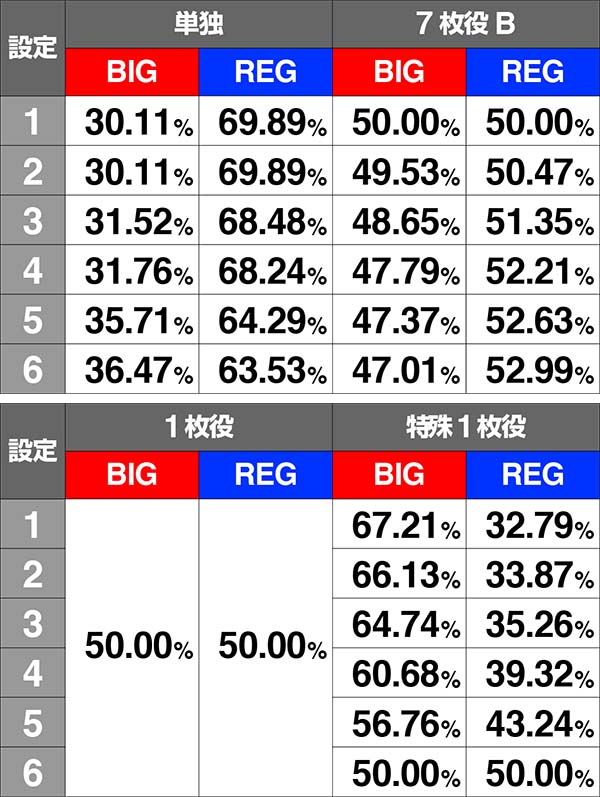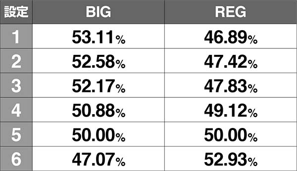 特殊1枚役からのボーナス比率は、設定6ならBIGとREGが1:1となる。