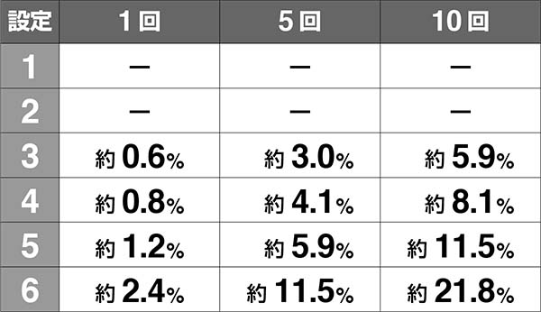 設定6ならBIGを10回引ければ、理論上約22%でハズレが出る。