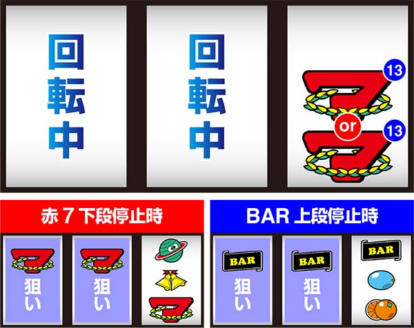 右リール下段に赤7が停止すればBIG、上段にBARが停止したらREG。