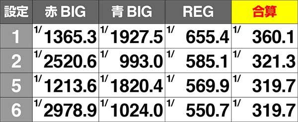 弱スイカからのREGは、分母が大きいためブレる可能性も高いが、設定1・2よりも設定6のほうが2倍当たりやすいためチェックしておきたい。