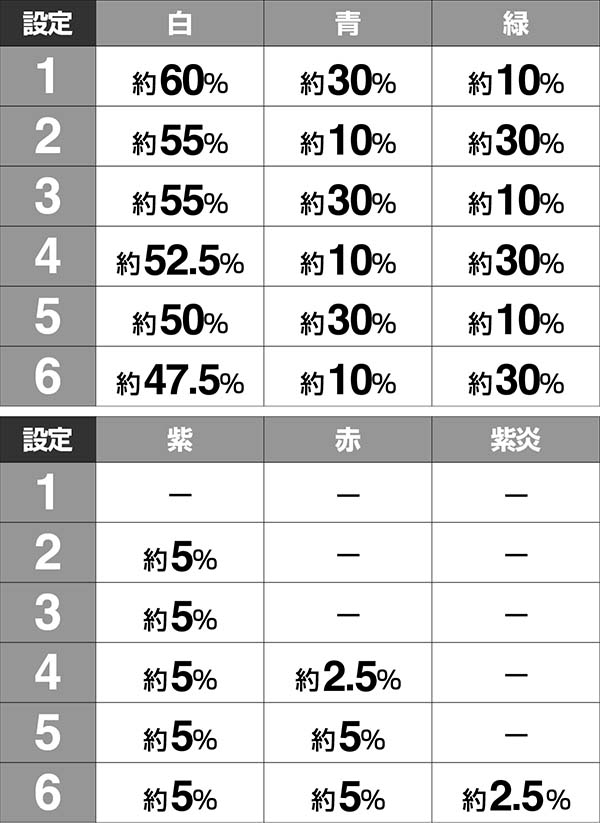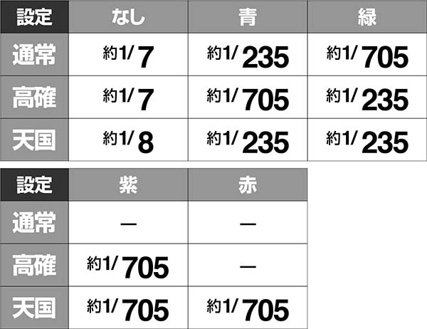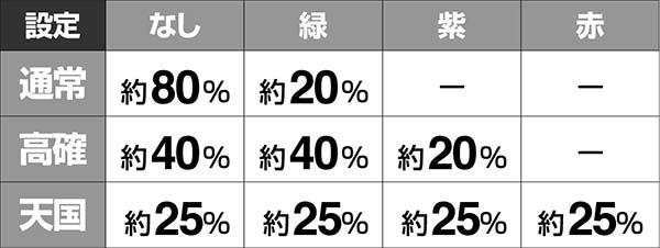 青は通常と天国で発生しやすく、緑は高確以上で出現率が高い。