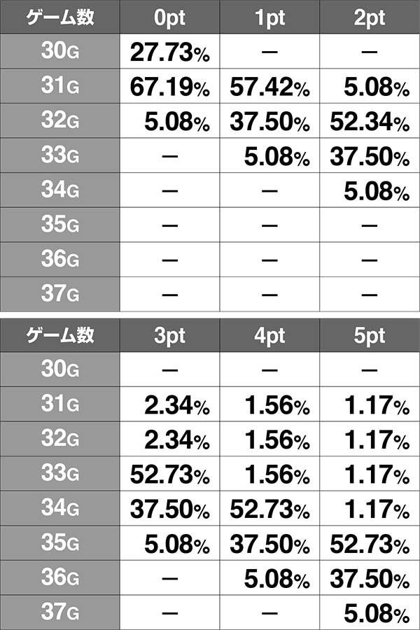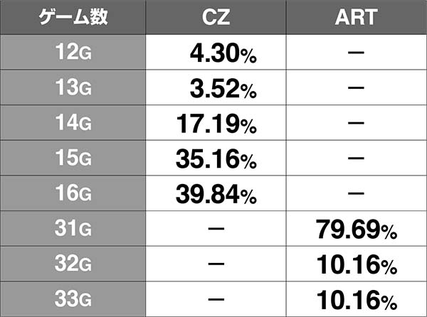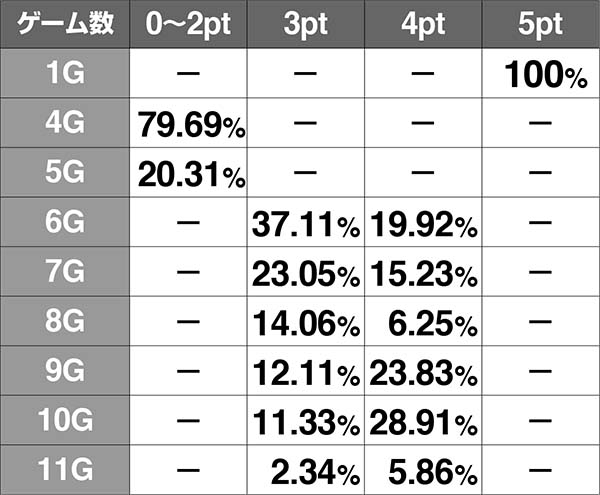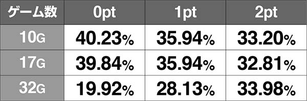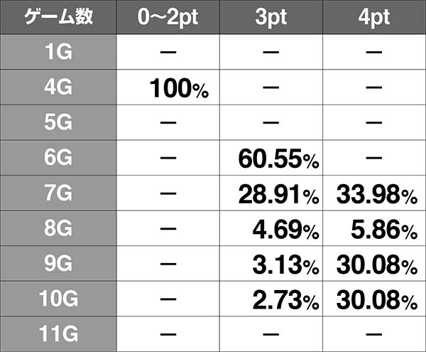4pt以下でARTに当選した場合は最大33Gの前兆を経由、5pt以上ならART確定かつ前兆を経由せずに告知される。