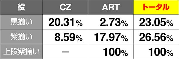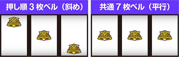 払い出しは共通ベルが平行揃い(7枚)、押し順ベルが斜め揃い(3枚)なので、ART中だけでなく通常時も判別が可能だ。