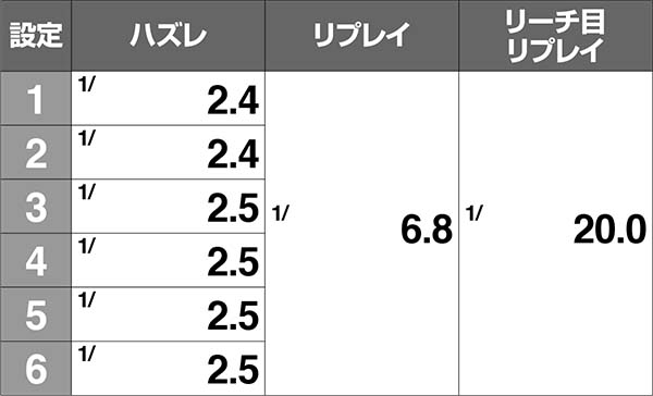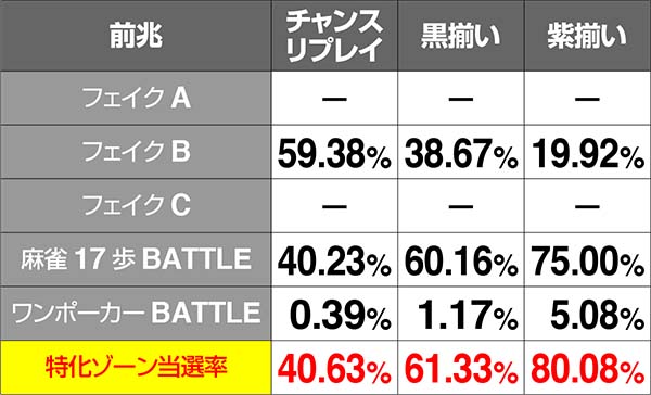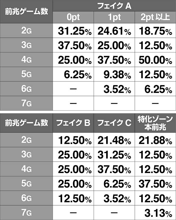 本前兆のゲーム数は2〜7G、フェイク前兆(A〜C)は2G〜6Gとなる。