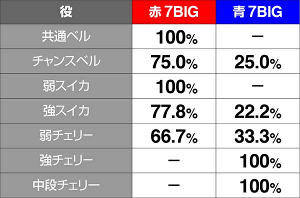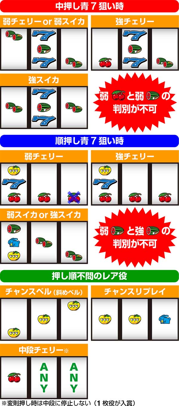 左リールに青7を狙えば右下がりスイカ揃い時以外(弱スイカと弱チェリー)は、小役の判別が可能だ。