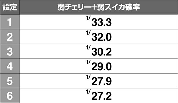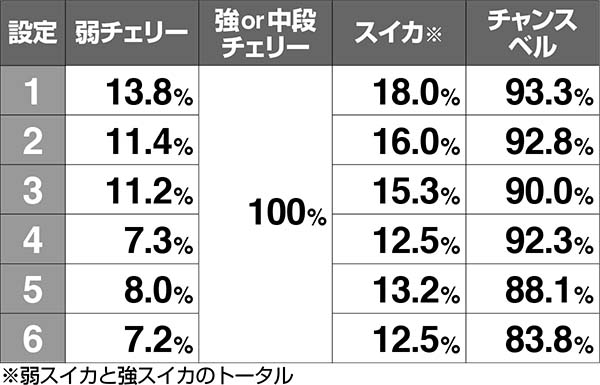 中押し時は設定差のある弱チェリーと弱スイカ(設定差なし)の判別ができないため合算してチェック。