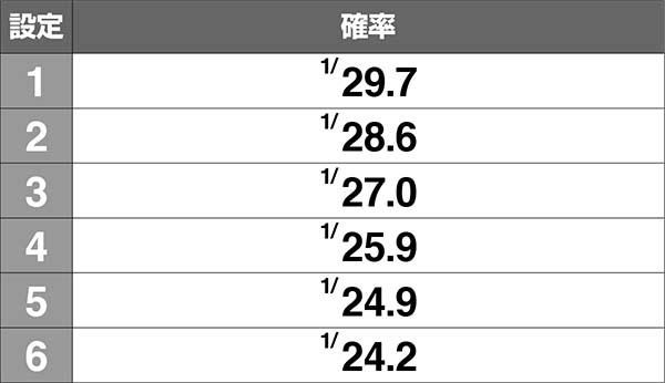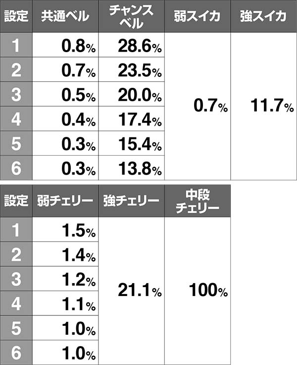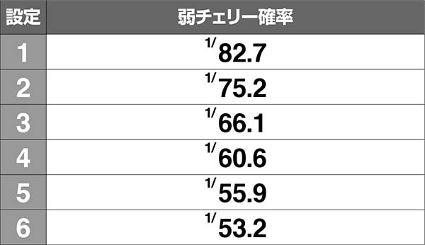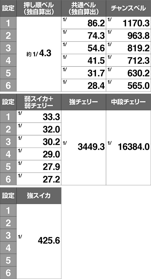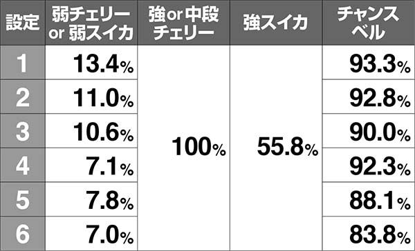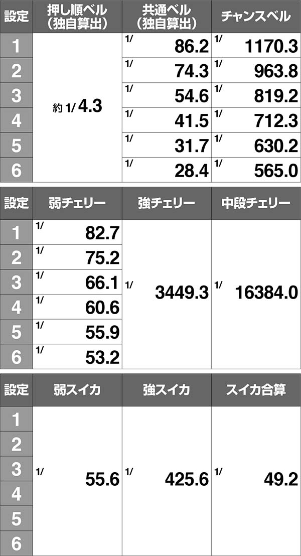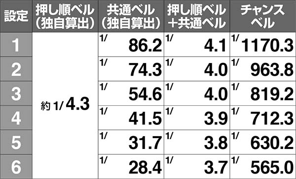 チャンスベル(斜めベル)確率は高設定ほど優遇されており、設定1と6では約3.5倍の差がある。