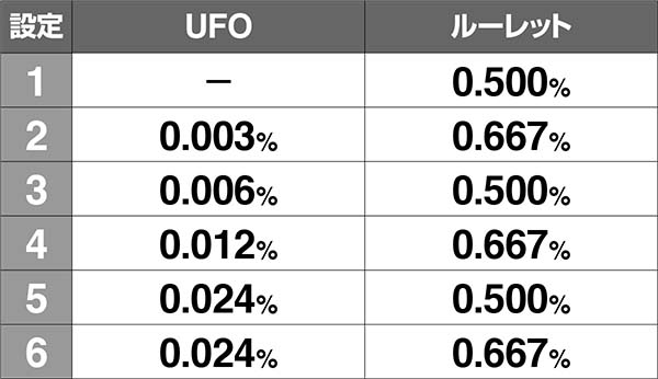 演出紹介時の内容がルーレット演出なら偶数設定示唆、UFO演出なら設定2以上確定だ。