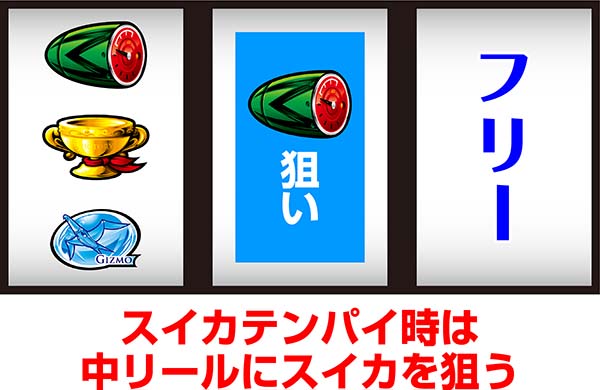 右リールをフリー打ちし、スイカがテンパイした時だけ中リールにも目押しが必要。