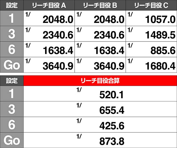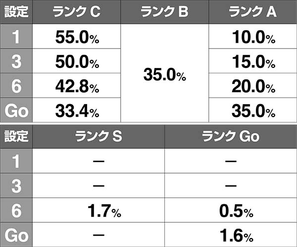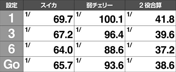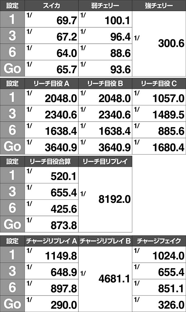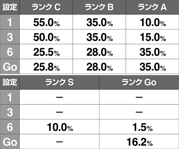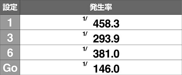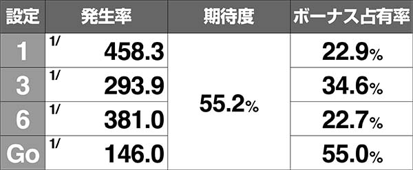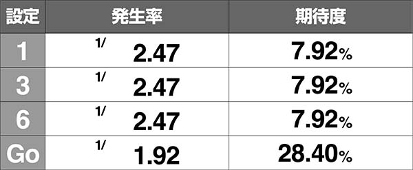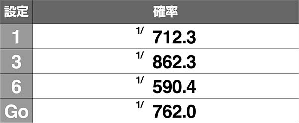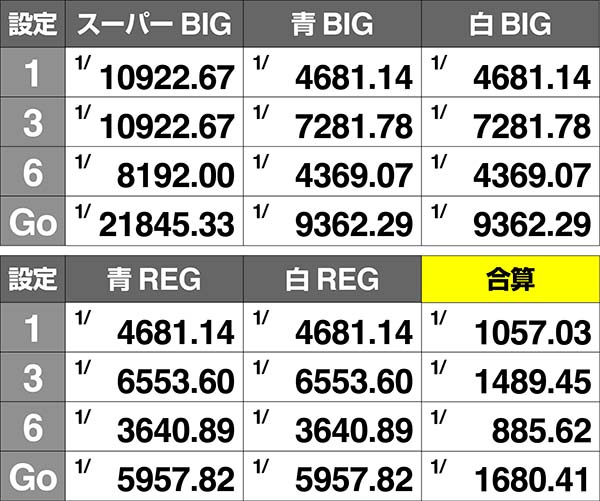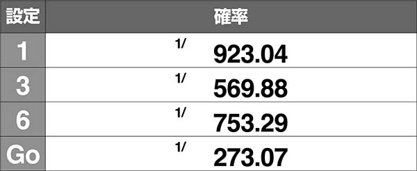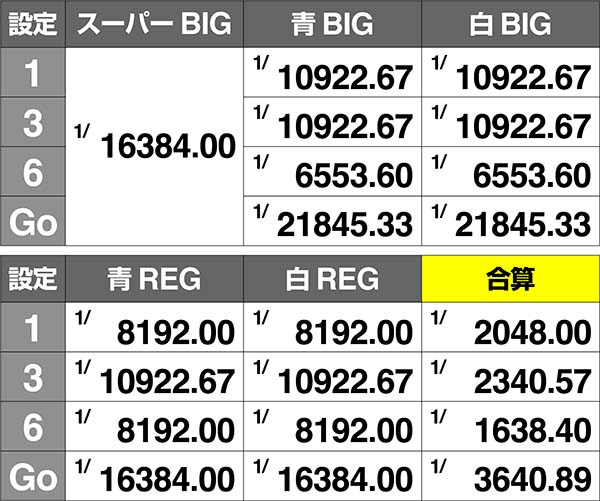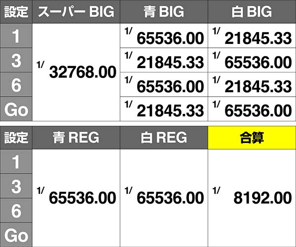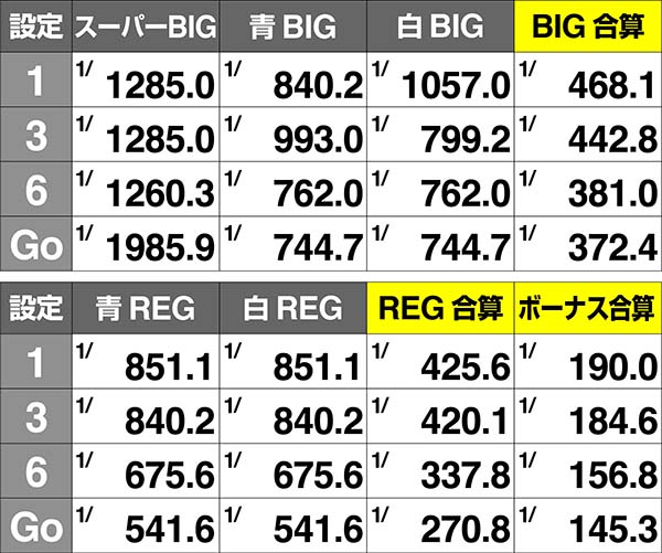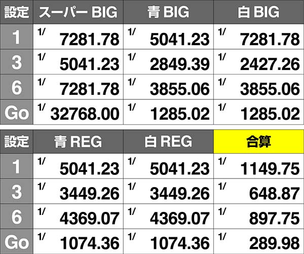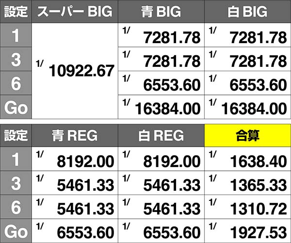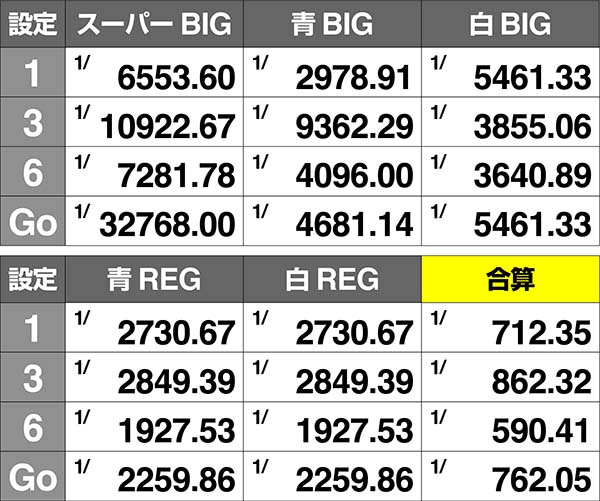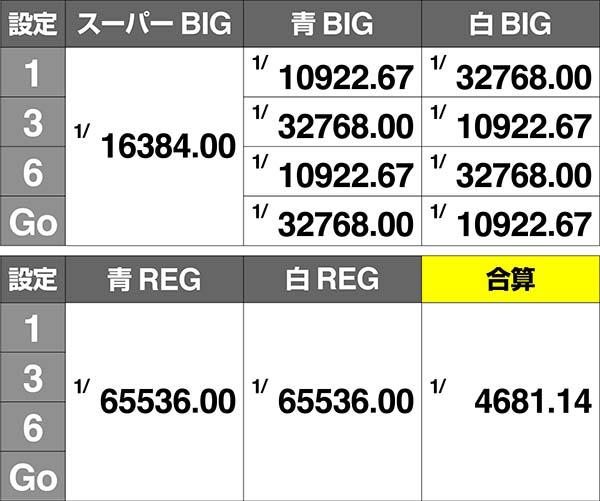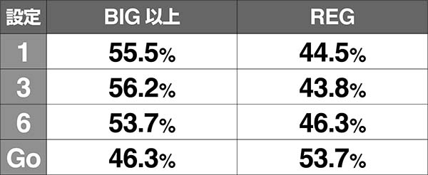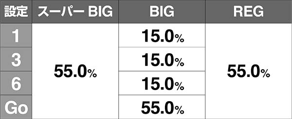 設定GoはスーパーBIG確率がもっとも低く、BIGとREG確率が高い。