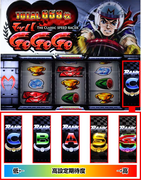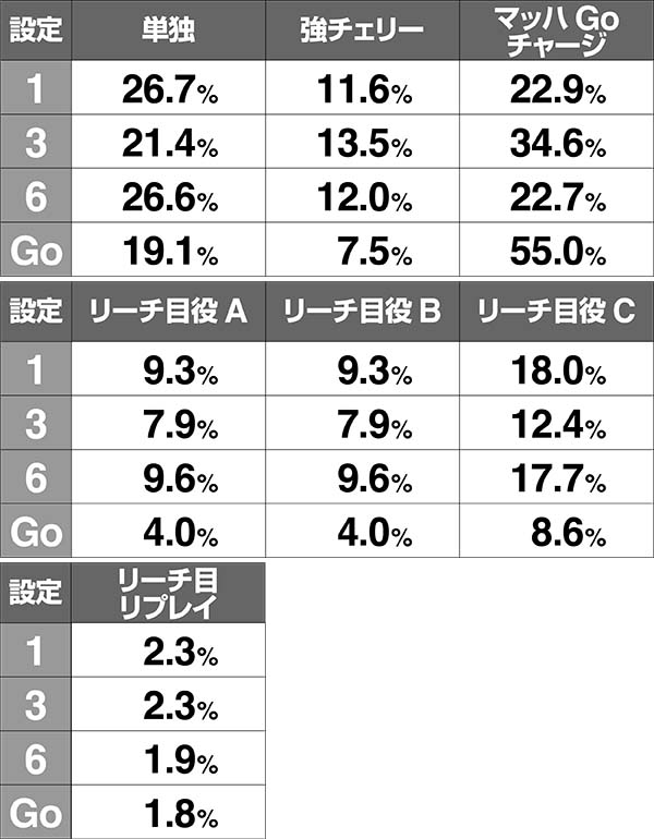 もっとも特徴的なのは設定Goの挙動で、ボーナス当選契機の55%がマッハGoチャージとなる。