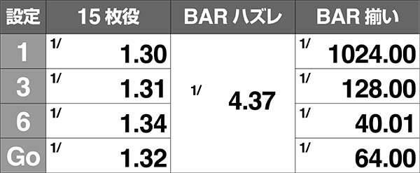 REG中のBAR揃い確率に大きな設定差があるため、揃った時点で設定3以上かつ設定6やGoにも期待が持てる。