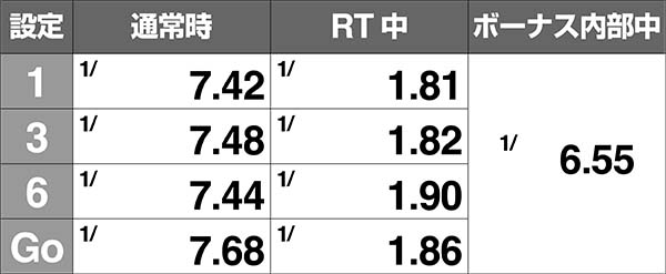 設定1〜6はBIG後のBAR揃い確率が下がるが、設定Goはどのボーナス後でも確率が変わらないので、RT突入率に大きな設定差が生まれる。
