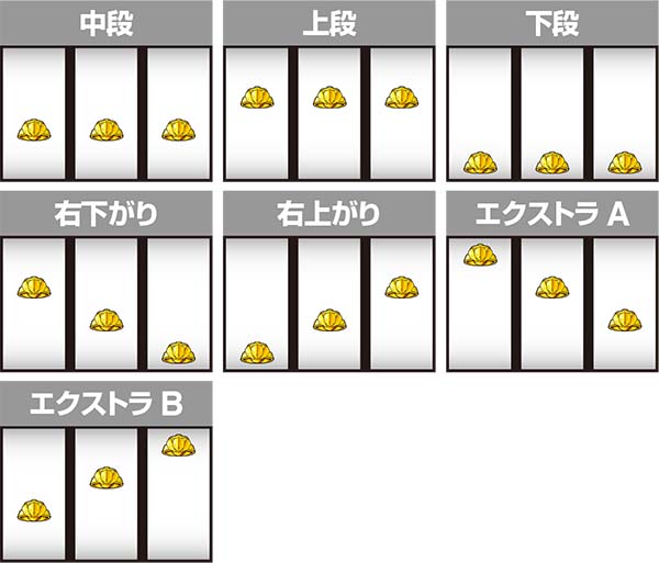 本機は通常の5ラインに加え、枠上揃い・枠上右下がり・左リール中段からの右上がりを足した変則8ライン。