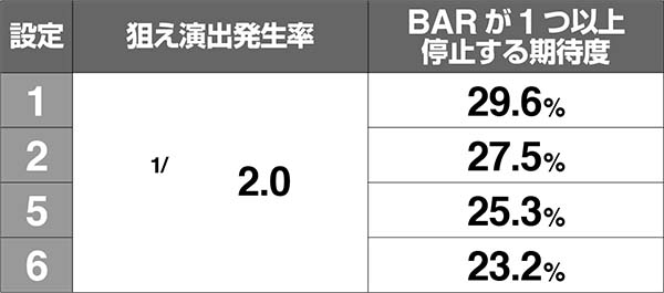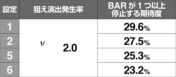 狙え演出の確率は2分の1(フェイクリプレイとBAR停止リプレイの合算)、BIG後のほうがBAR停止リプレイの確率が高いためRT突入率が高くなる。
