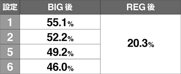 BIG後のRT突入率は高設定ほど低く、REG後は全設定共通。