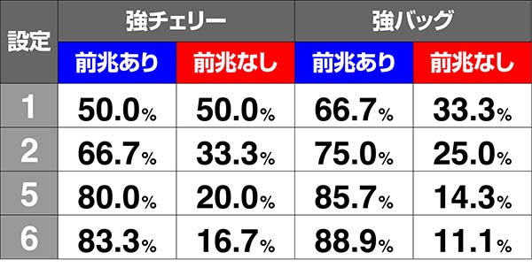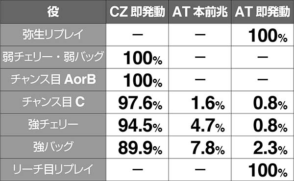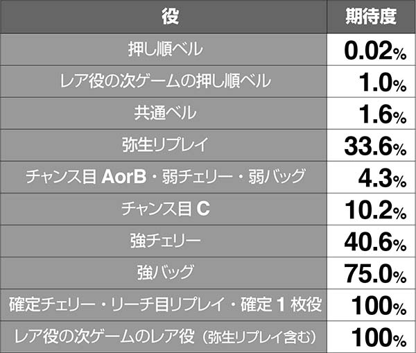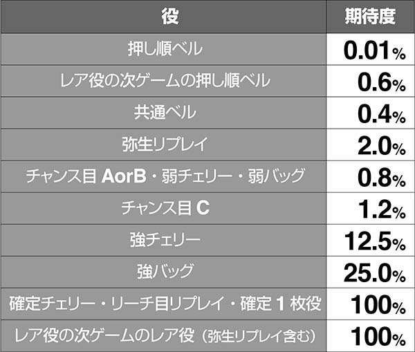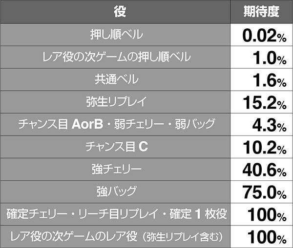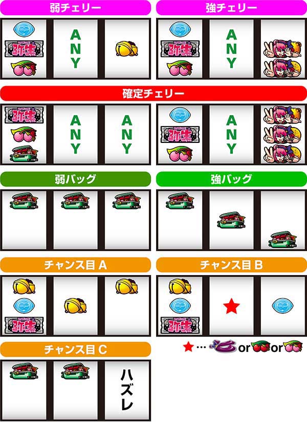 ベル<チャンス目A・B<弱バッグ<弱チェリー<チャンス目C<強チェリー<強バッグ<確定役