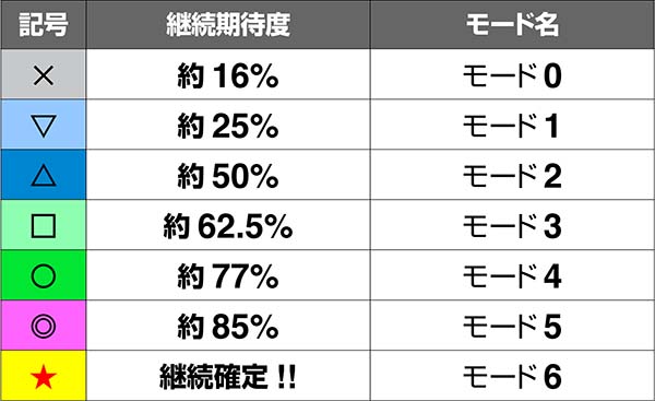 上位の継続モードほど小役で継続しやすいため、結果的にトータルの継続期待度がアップする。