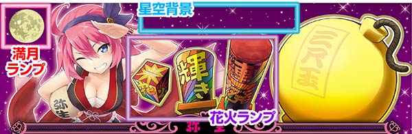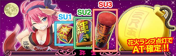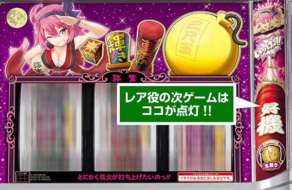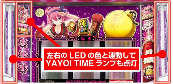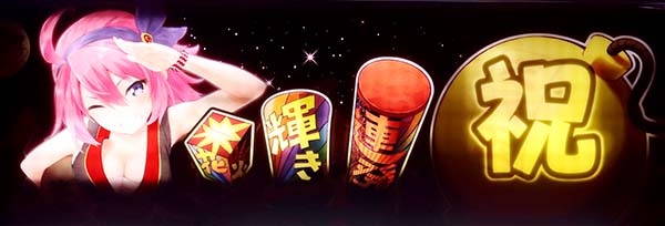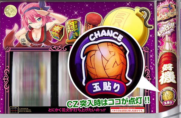 とにかく花火が打ち上げたいのっ!!…HANABIシリーズの弥生ちゃんが主役となって、高純増の快速AT機で大活躍する。 通常時からのAT当選契機は小役で抽選されるCZ・玉貼りチャンスと確定役→直行という2パターン。 AT「YAYOI TIME」は純増約4.5枚/G、1セット約100枚獲得できるマップ管理型となっており、セットによって継続期待度が変化。消化中は成立役による継続抽選がおこなわれる。 |