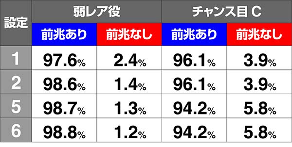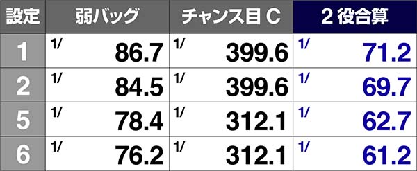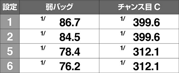 設定差のある小役は弱バッグとチャンス目Cの2つ。