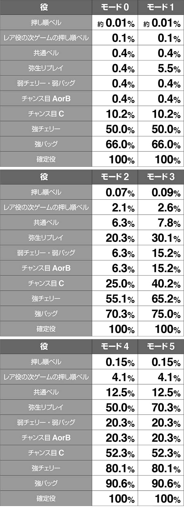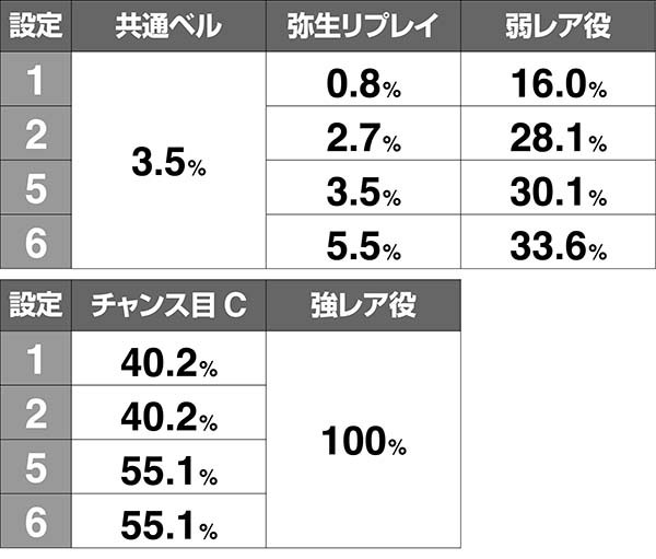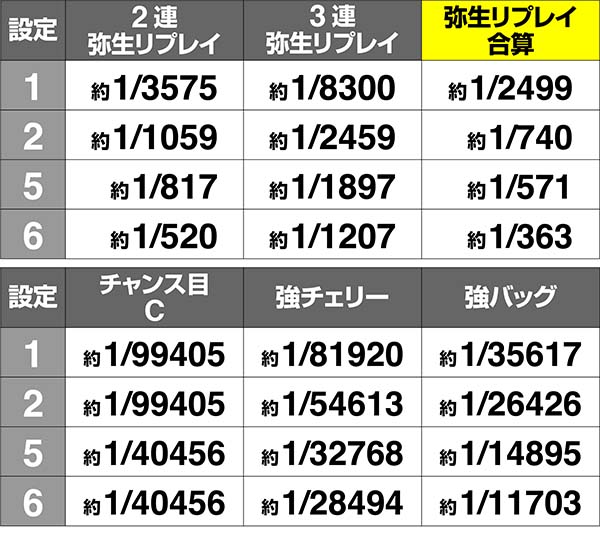 弥生リプレイの設定差がかなり大きいが、見た目は通常のリプレイなので判別が難しい(レア役を引かずにCZに当選すれば弥生リプレイの可能性大)。