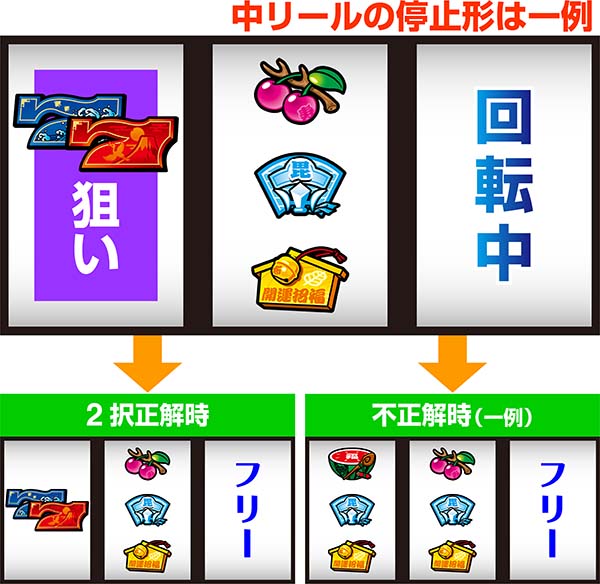 BIG中に成立する2択9枚役(赤頭or青頭)は中リールに青7をビタ押しをすることでどちらが成立しているかを判別可能。