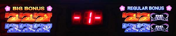 レバーONでリール下のナナセグに何らかのアクションが発生した場合はチェリーとスイカを否定、法則崩れでボーナス濃厚だ。
