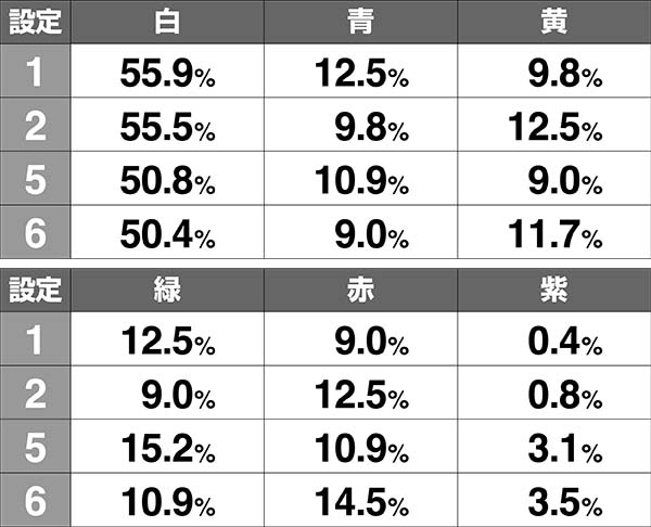 青・緑は奇数、黄・赤は偶数設定を示唆しており、紫が出現すれば設定5以上の大チャンスだ。