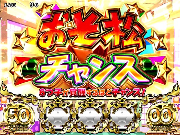 矯正計画中にBIGを引き戻せばおそMAXカウンターが点灯、6つすべて点灯させればBIGが80%ループする“SUPERおそMAXさんBONUS”をゲットできるので、32G以内の連チャンはかなり重要だ。