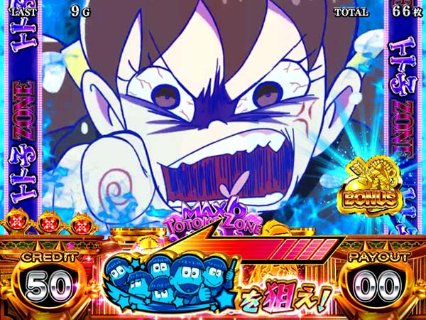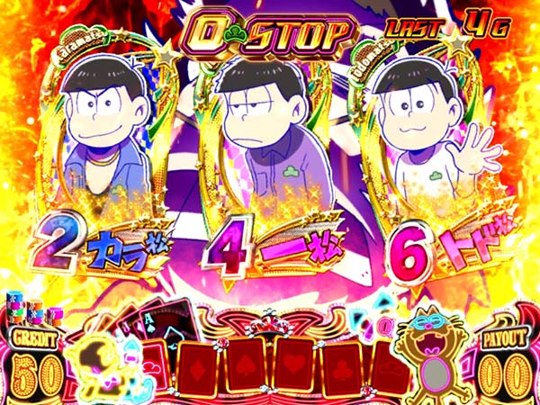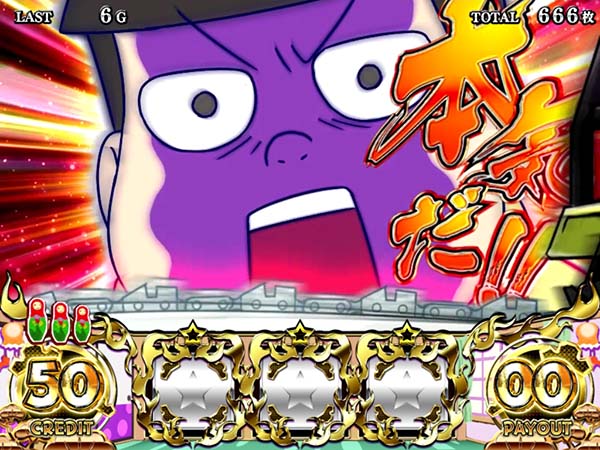32Gを超えることなくBIGを6回引き戻せば、おそMAXカウンターが全点灯し、最強のボーナス“SUPERおそMAXさんBONUS”をGETできる。