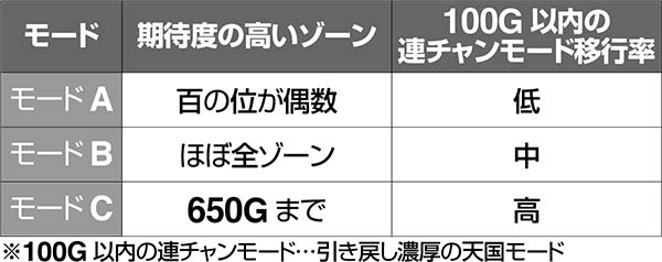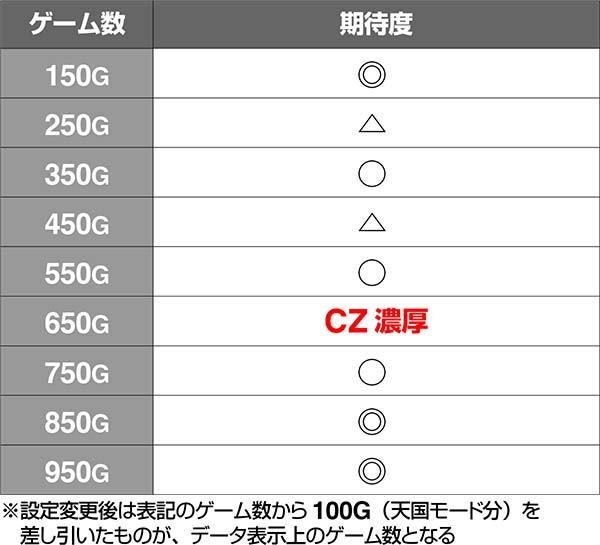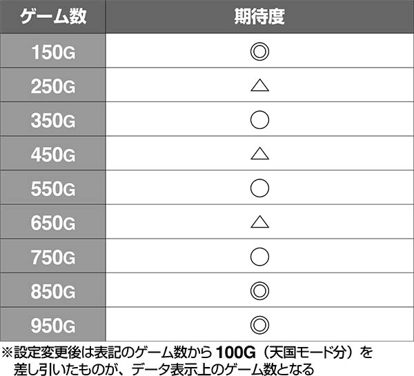 2:設定変更後…550G消化後、ボーナス終了後…650G(天国モードの100Gを含む)消化後。