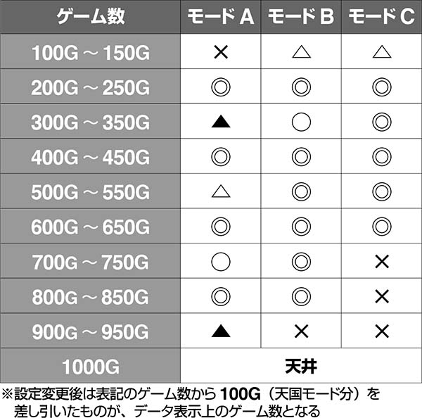1:設定変更後…900G消化後、ボーナス終了後…1000G(天国モードの100Gを含む)消化後。