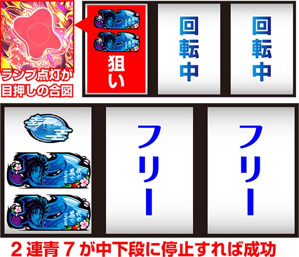 軍配ランプ非点灯時や14枚役獲得後は、左リールに青7を避けつつ、中右リールをフリー打ちすればOKだ。