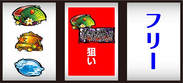 リール左側にある軍配ランプ点灯時に2連青7を枠内に目押しし、中下段に停止すれば成功(中右リールはフリー打ち)となり14枚を獲得できる。