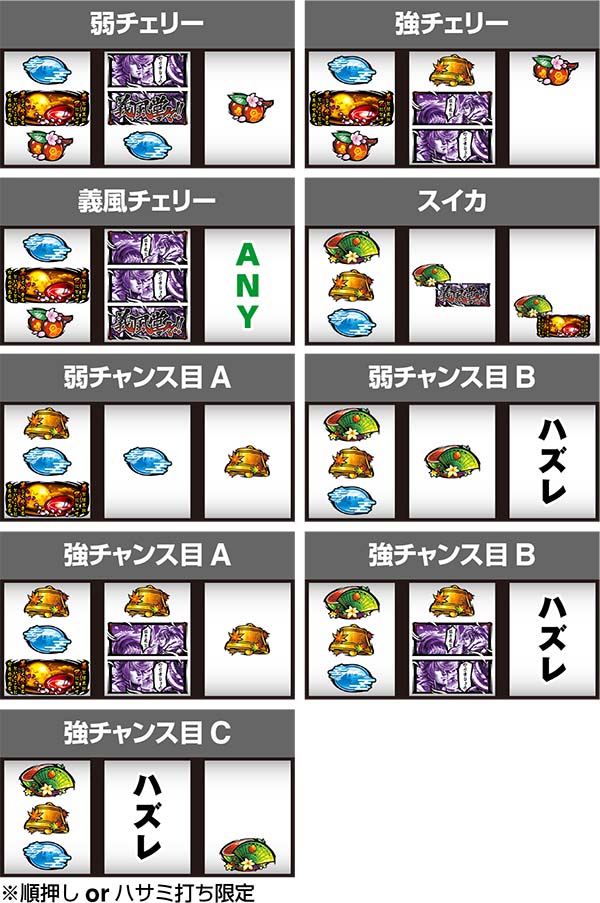リプレイ<スイカ<弱チェリー<弱チャンス目<強チェリー<強チャンス目<義風チェリー=義風役A・B