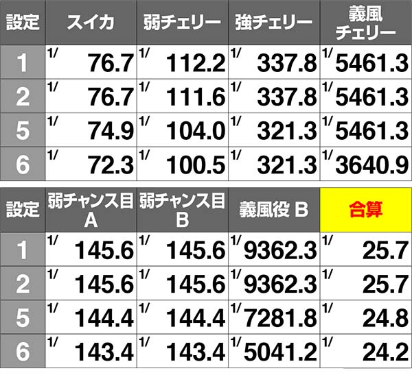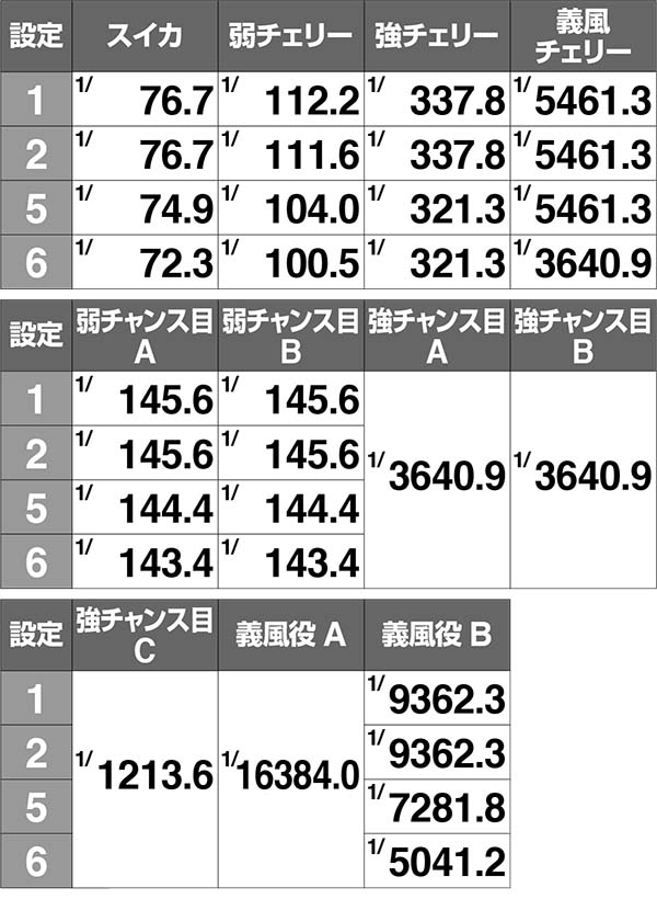 レア役は強チャンス目以外、確定役は義風チェリーと義風役Bに設定差が存在。