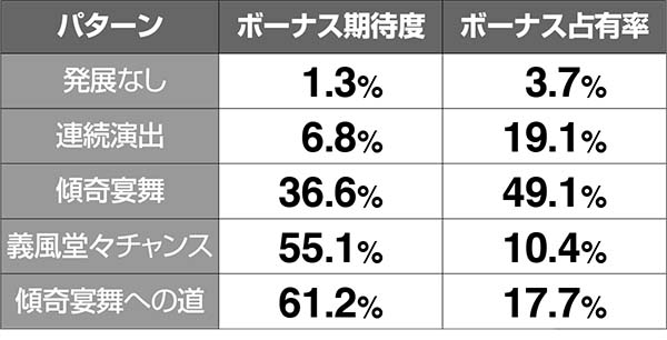 傾奇宴舞への道(最終的に傾奇宴舞へ発展する演出)を含めると、66.8%が傾奇宴舞からのボーナスとなる。